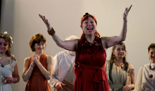 Elle nous offre même, dans le deuxième acte, une joyeuse parodie du chœur antique (les chœurs reprenant ce que le personnage principal défend).