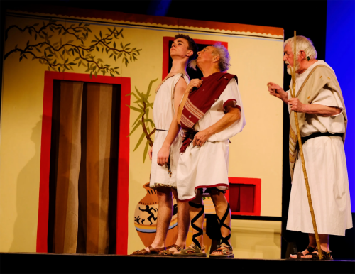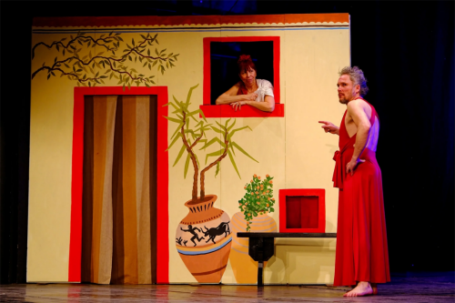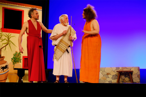 Même si j’ai souhaité accentuer le côté clownesque avec des décors proches du dessin animé. Il faut dire que les personnages le permettent facilement : la tempétueuse Praxagora, le colérique Blépyros, le débonnaire Carion, le bellâtre Kallos, Chrémès le vieil avare, la rusée Sostraté, l’immonde sycophante … et les quelques femmes qui papillonnent tout autour, tantôt provocatrices, tantôt faussement ingénues, mais jamais stupides.