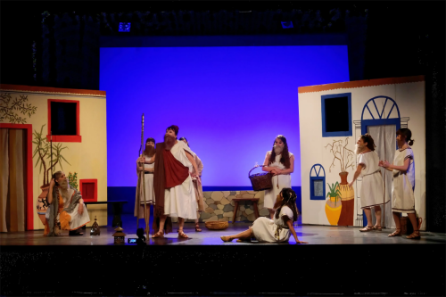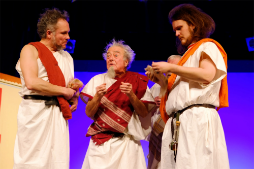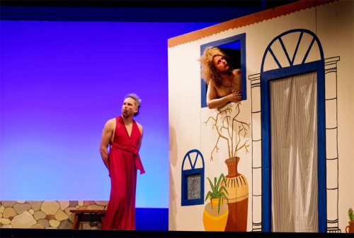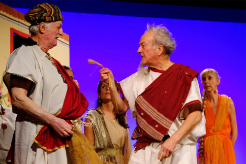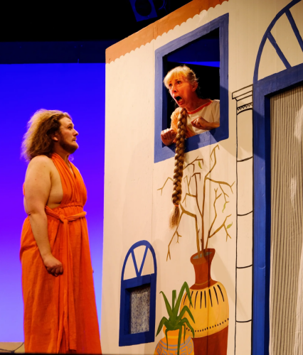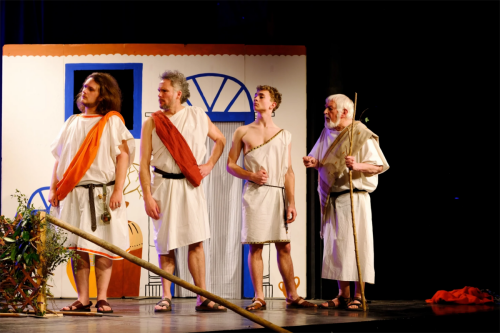 Même si j’ai souhaité accentuer le côté clownesque avec des décors proches du dessin animé. Il faut dire que les personnages le permettent facilement : la tempétueuse Praxagora, le colérique Blépyros, le débonnaire Carion, le bellâtre Kallos, Chrémès le vieil avare, la rusée Sostraté, l’immonde sycophante … et les quelques femmes qui papillonnent tout autour, tantôt provocatrices, tantôt faussement ingénues, mais jamais stupides.